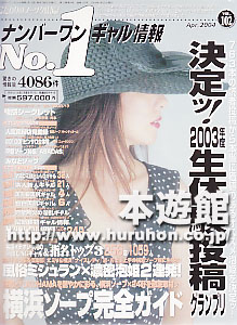 今月のナンバーワンギャル情報2004年01月号杉浦ゆか「吉原・クラブワールド」(表紙)、沢口「吉原・ダイヤモンドクラブ夕月」、けい「吉原・シャトーペトリュス」、セリカ「吉原・WHITY」、片桐ありさ「吉原・クラブP&B」、真純まこ「吉原・恵