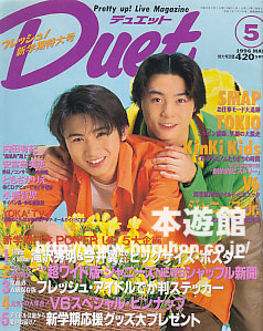 デュエット1996年05月号KINKI KIDS(表紙)、V6、内田有紀、安室奈美恵、小橋裕貴、榎本加奈子、赤坂晃、ともさかりえ、佐野瑞樹、MAX、鳥羽潤、安達祐実、佐藤敦啓、TOKIO、滝沢秀明、川野直輝、今井翼、SMAP、モノクロ(長瀬